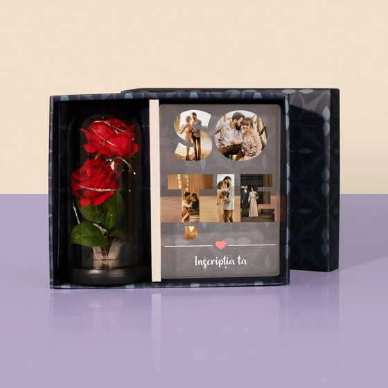 Colaj De Fotografii: Împreună E Cel Mai Bine - Set cadou cu imprimare pe sticlă și trandafirul etern