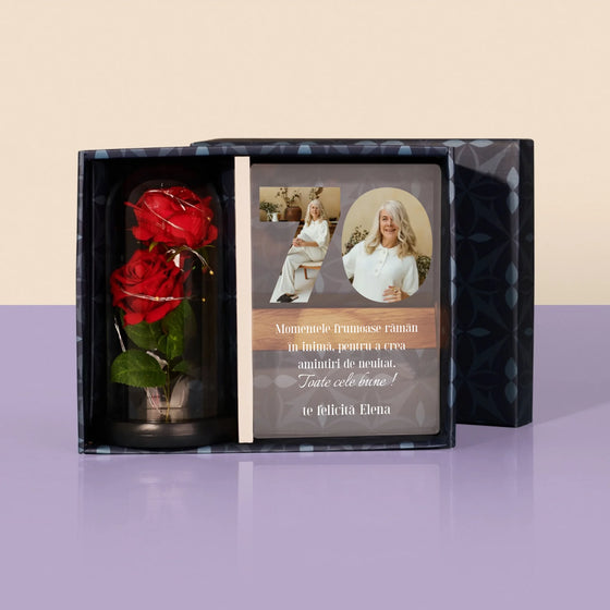 160 leipreț unitar /Nu este disponibilCuvânt Din Fotografii: 70 Zi De Naștere - Set cadou cu imprimare pe sticlă și trandafirul etern