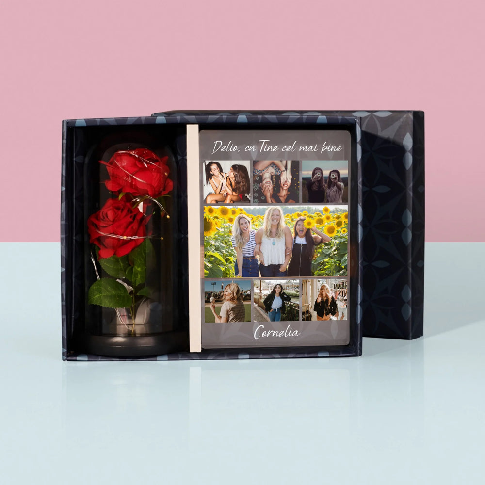 Colaj De Fotografii: Cea Mai Bună Prietenă - Set cadou cu imprimare pe sticlă și trandafirul etern