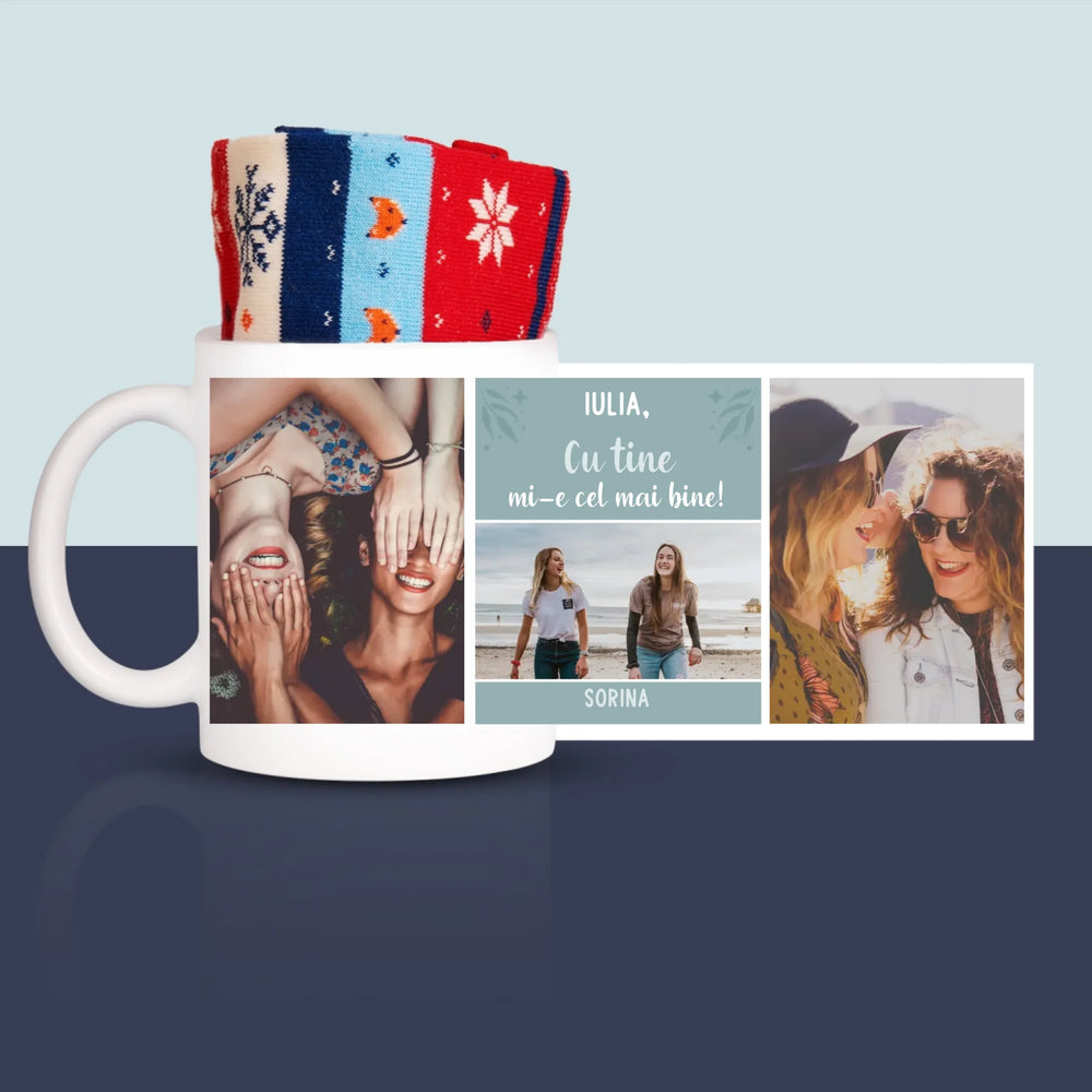 O cană de înaltă calitate cu personalizarea aleasă de tine și șosete în interior.