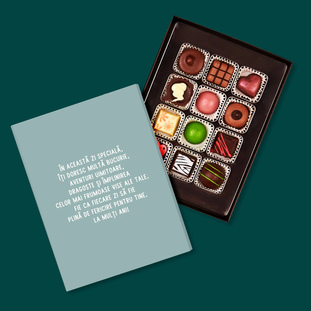 Praline delicioase din ciocolată belgiană într-o cutie elegantă cu personalizare la alegere.