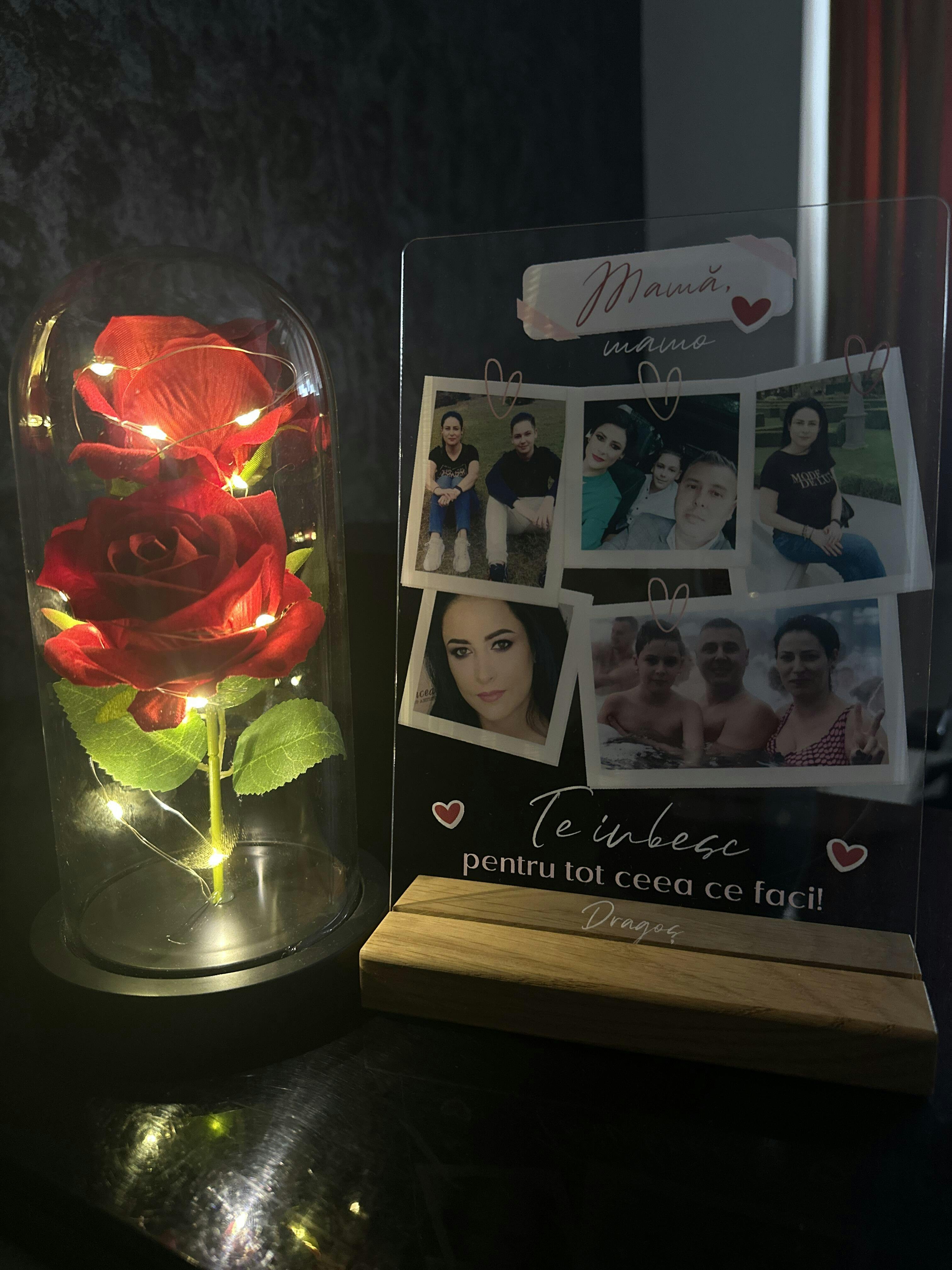 Un set cadou frumos cu imprimare pe sticlă acrilică. Include un trandafir etern în sticlă.
