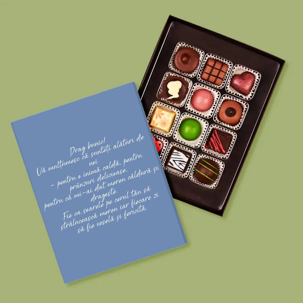 Un cadou unic care l-a surprins pe tatăl meu și i-a adus multă bucurie. Pralinele au fost delicioase, iar fotografiile le adaugă o notă personală. Calitate fantastică a manoperei și prezentare excelentă - foarte recomandat! Pralinele cu un colaj foto sunt o modalitate cu adevărat unică de a-i mulțumi tatălui pentru tot. Mama mea a spus că a fost unul dintre cele mai creative lucruri pe care le-a văzut vreodată - un succes garantat!