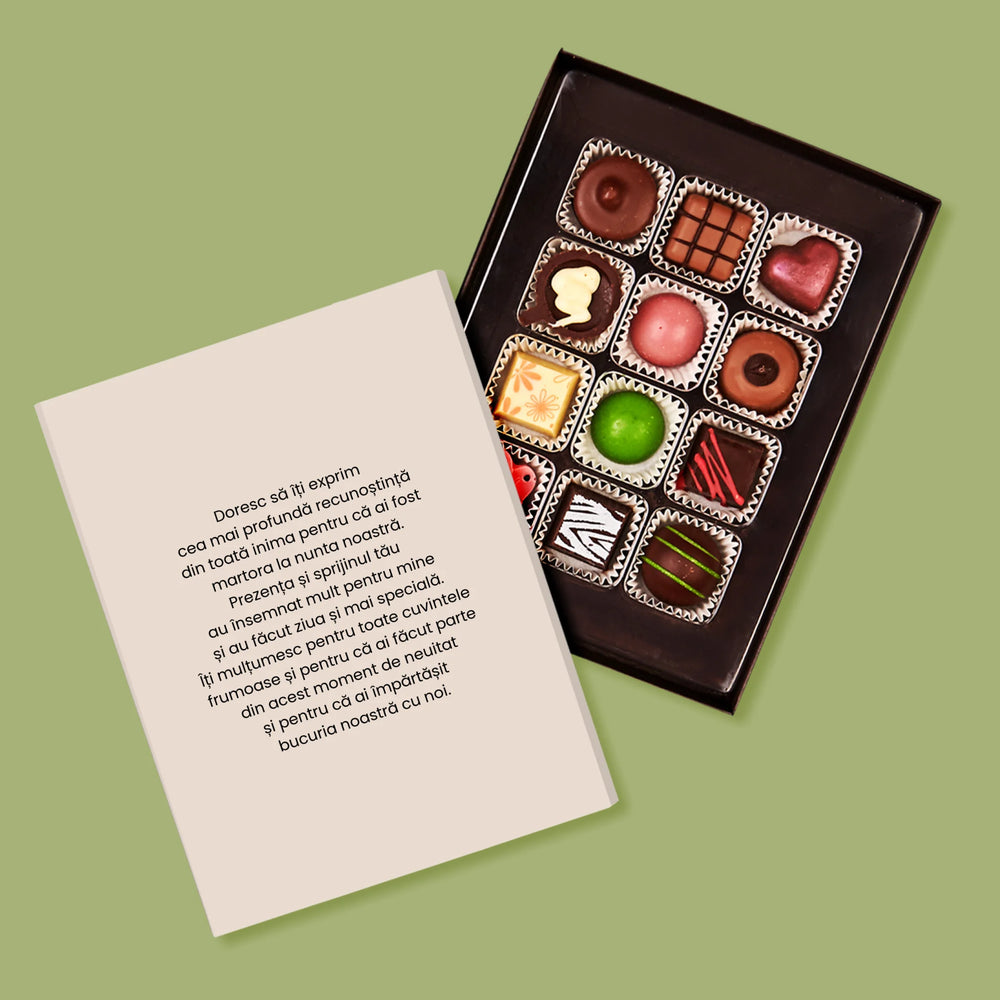 Praline delicioase din ciocolată belgiană într-o cutie elegantă cu personalizare la alegere.