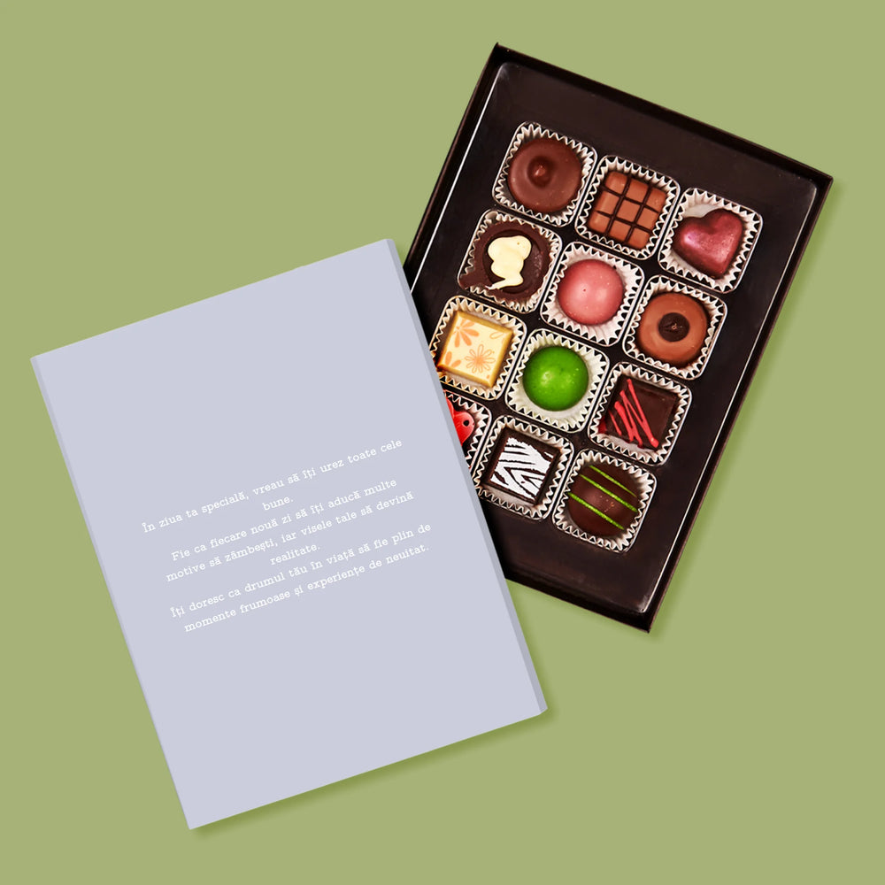 Dimensiuni: 20x15x3,5 cm. Număr pralină: 12.