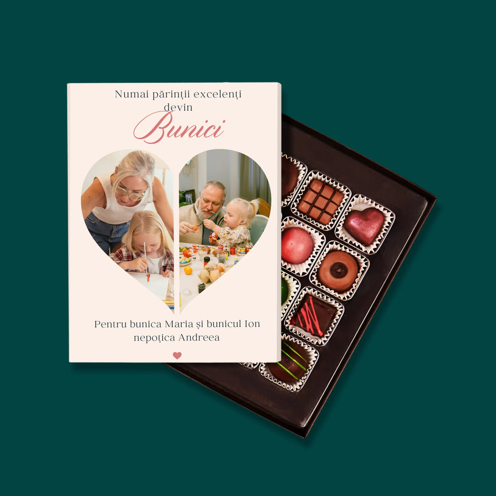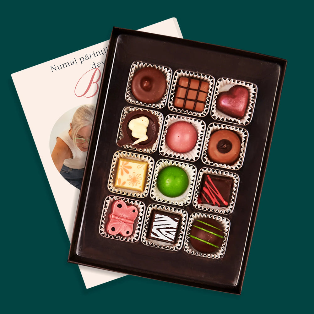 Dimensiuni: 20x15x3,5 cm. Număr pralină: 12.