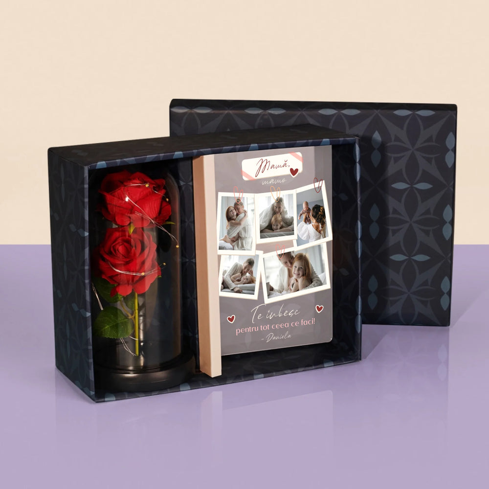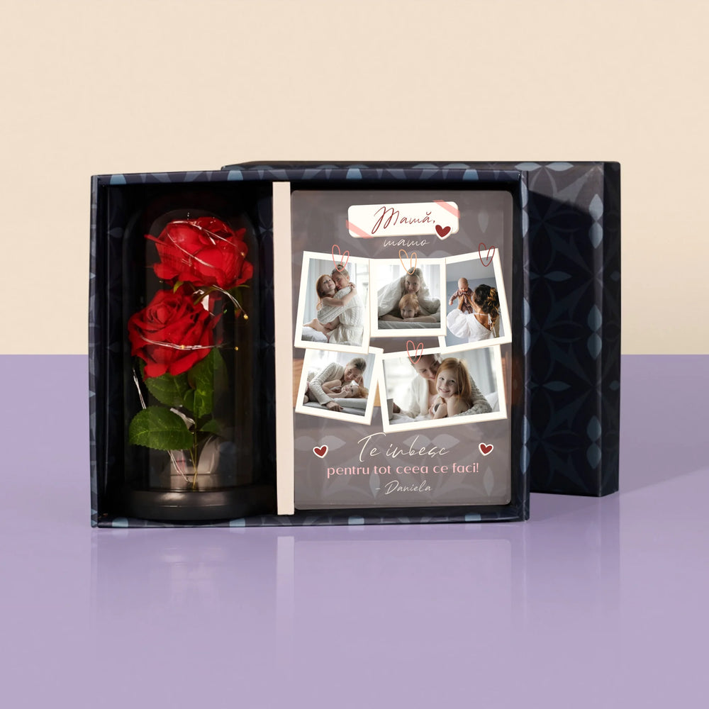 Colaj De Fotografii: Te Iubesc Mamă Fotografii - Set cadou cu imprimare pe sticlă și trandafirul etern