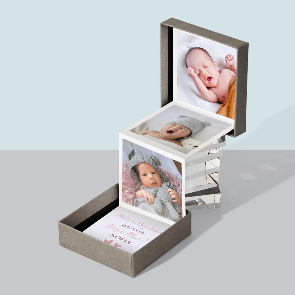 Produsul este compus din trei fotografii cu dimensiunile 6,68 x 6,68 cm si o felicitare personalizata cu destinatia aleasa.