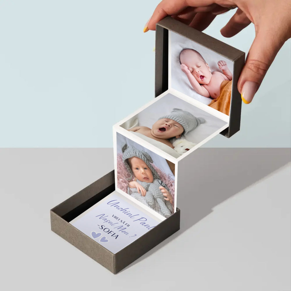 Produsul este compus din trei fotografii cu dimensiunile 6,68 x 6,68 cm si o felicitare personalizata cu destinatia aleasa.