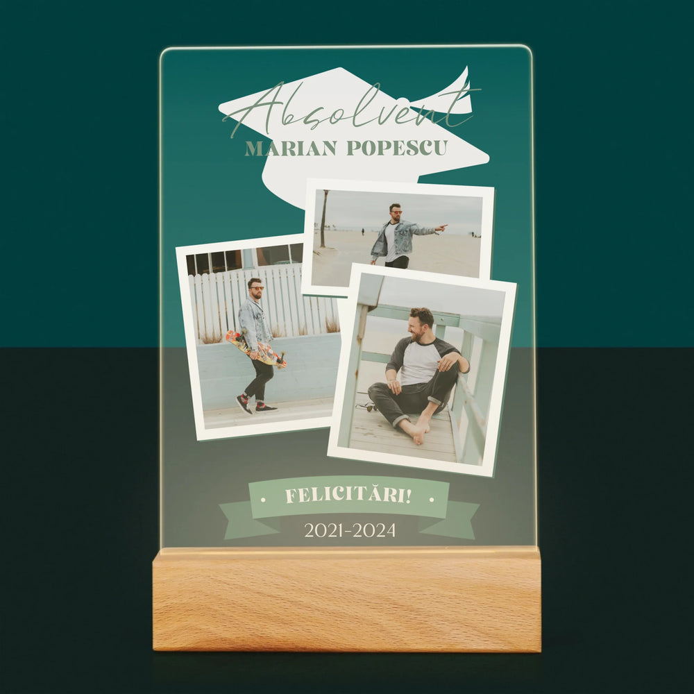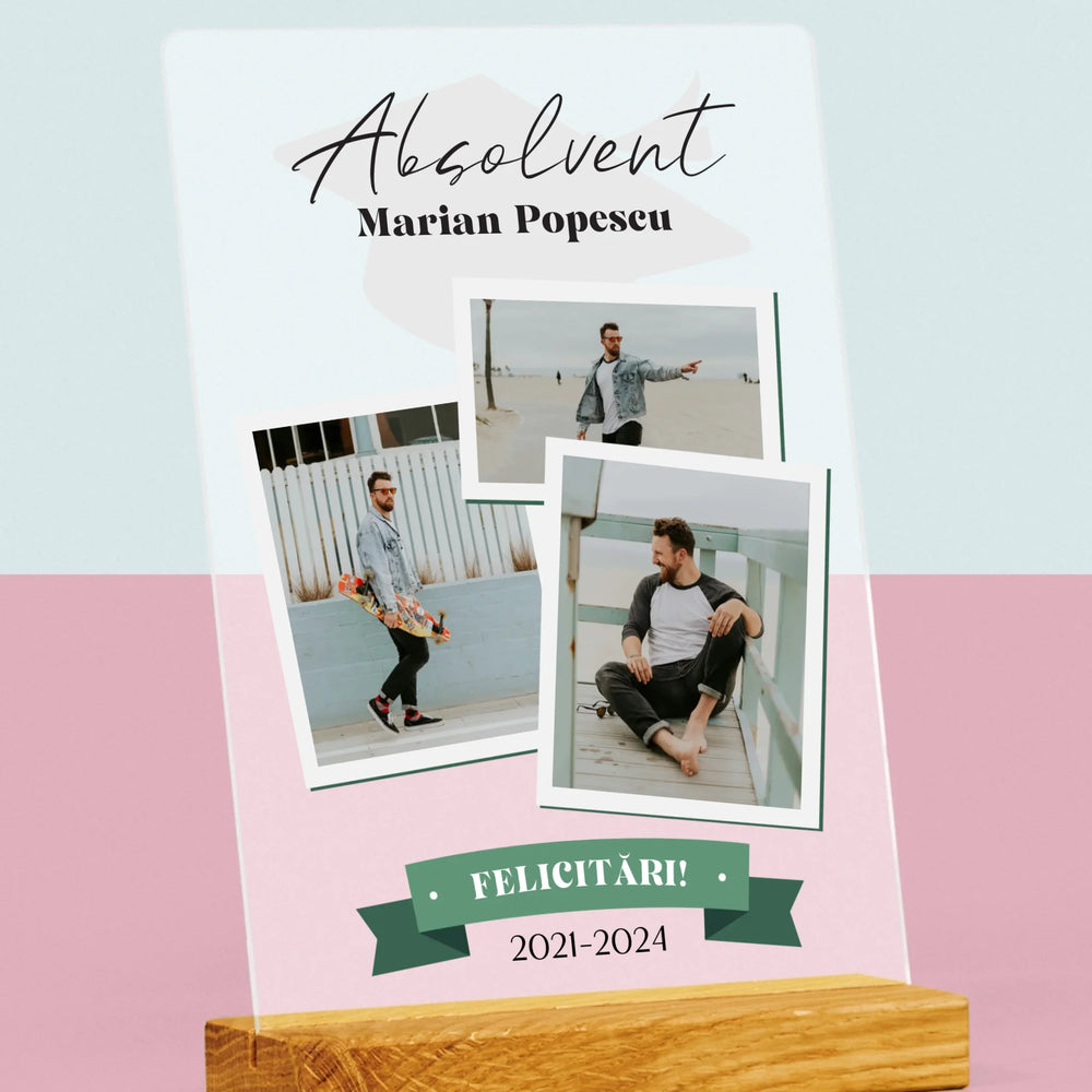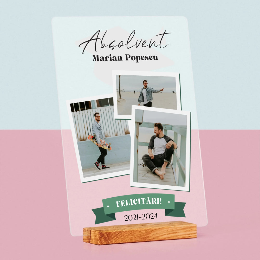 Dimensiunile sticlei A4: 29,5 x 22 cm, dimensiunile suportului din lemn: 15 x 4,5 cm
