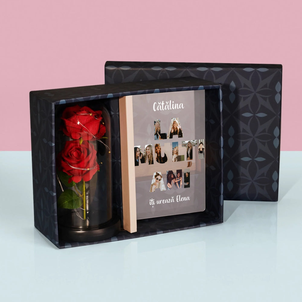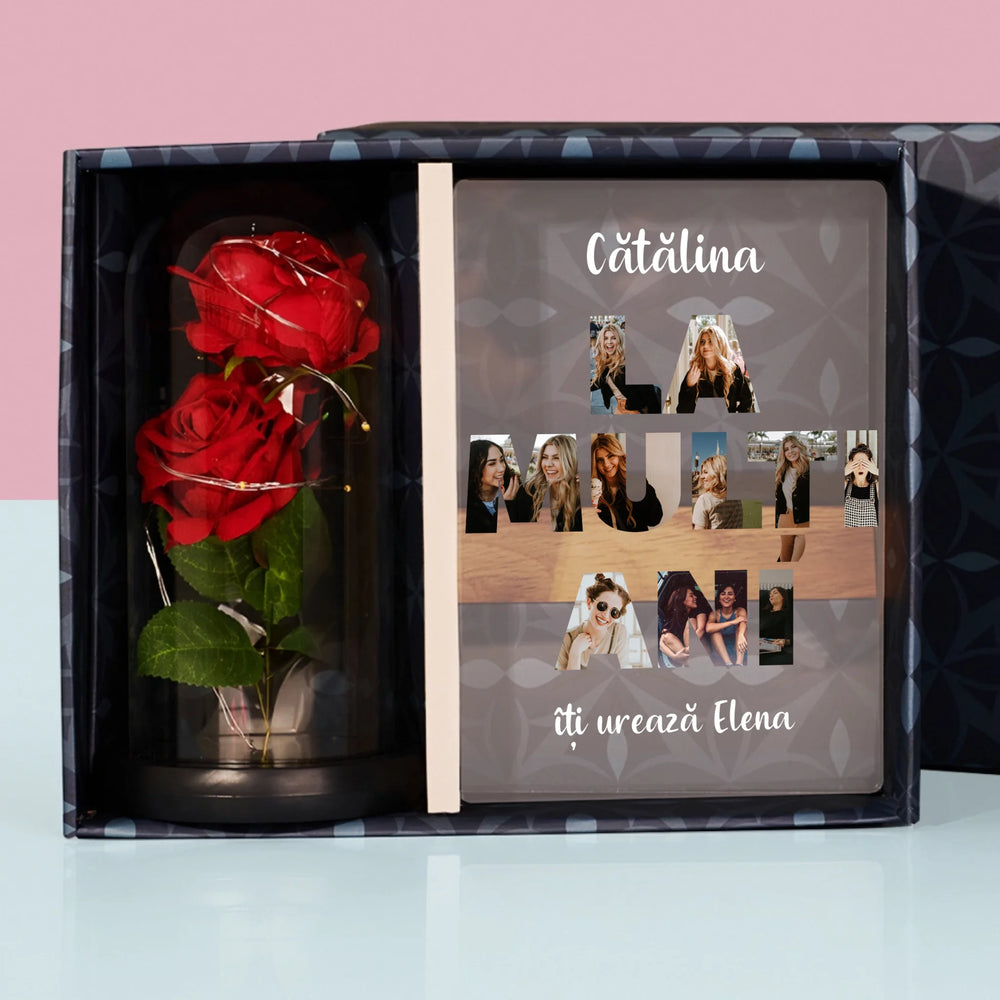 Cuvânt Din Fotografii: La Mulți Ani Din Fotografiile Tale - Set cadou cu imprimare pe sticlă și trandafirul etern
