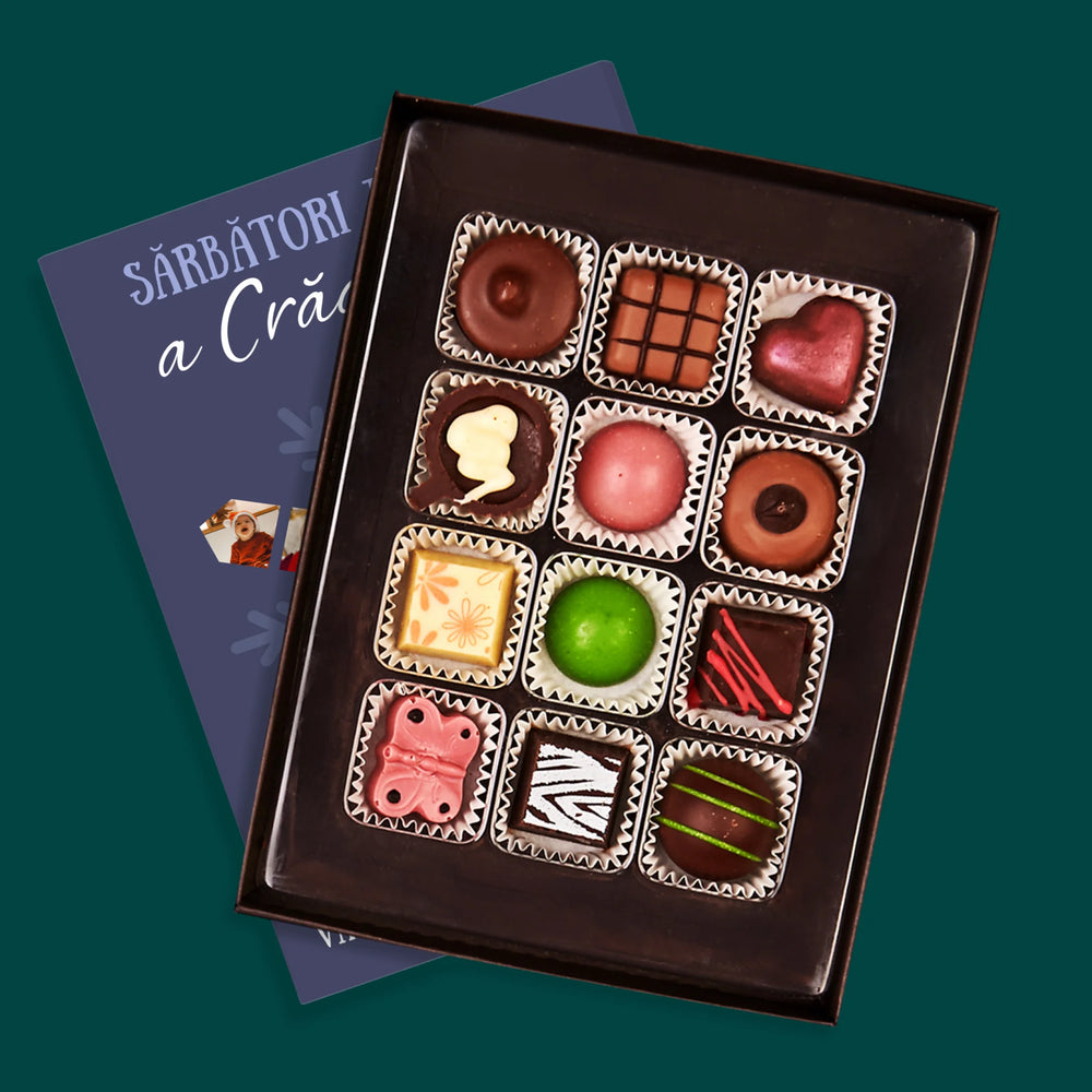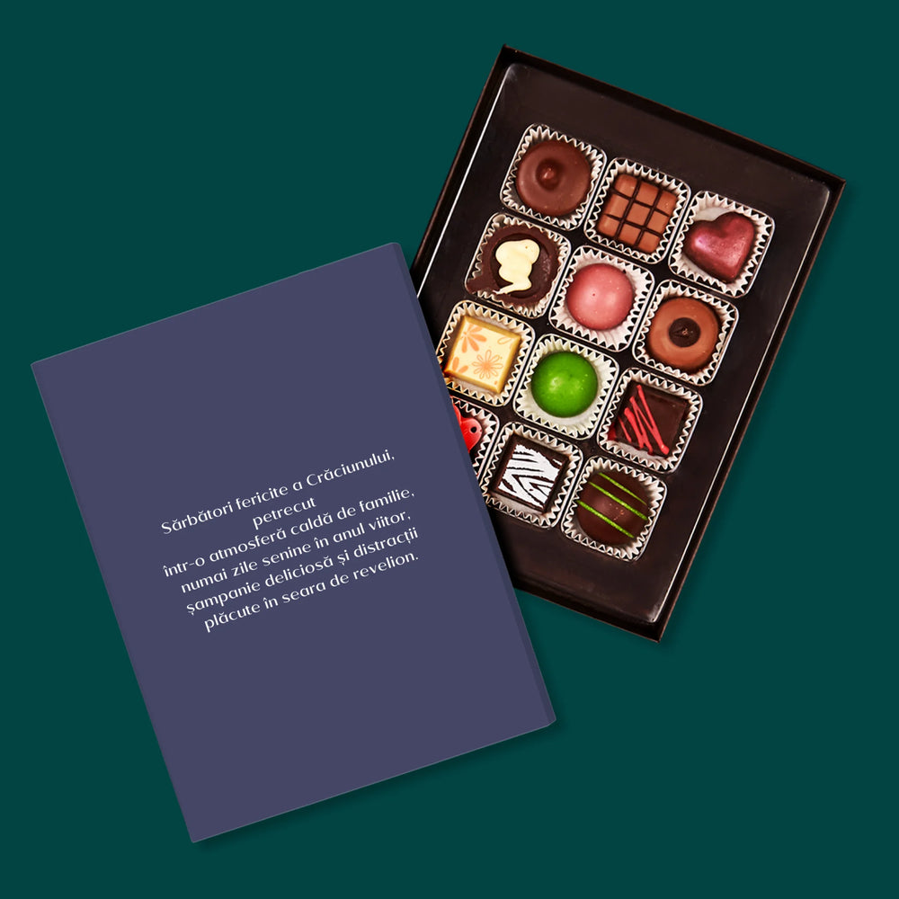 Dimensiuni: 20x15x3,5 cm. Număr pralină: 12.