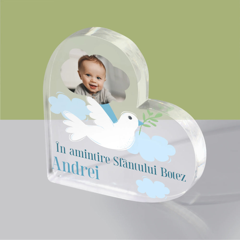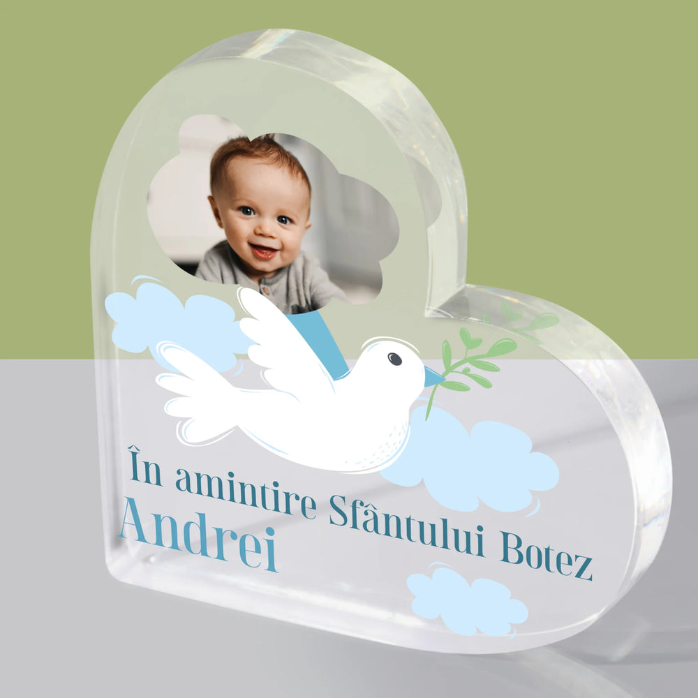 Fotografie și semnătură: Porumbel suvenir pentru botez - Inimă din bloc acrilic | RO