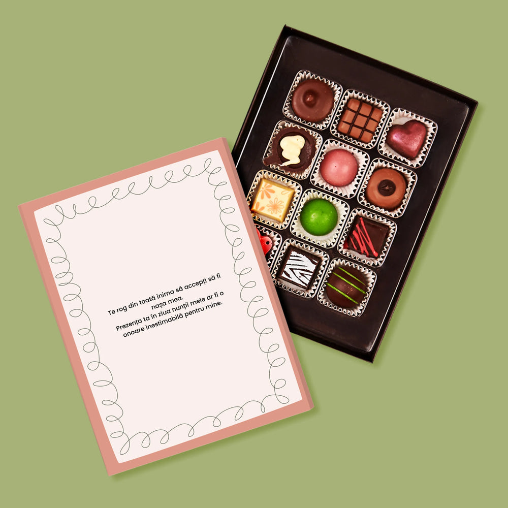Dimensiuni: 20x15x3,5 cm. Număr pralină: 12.