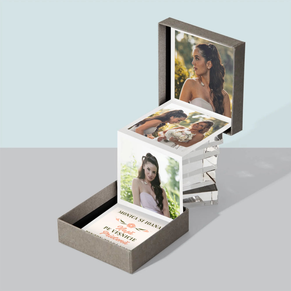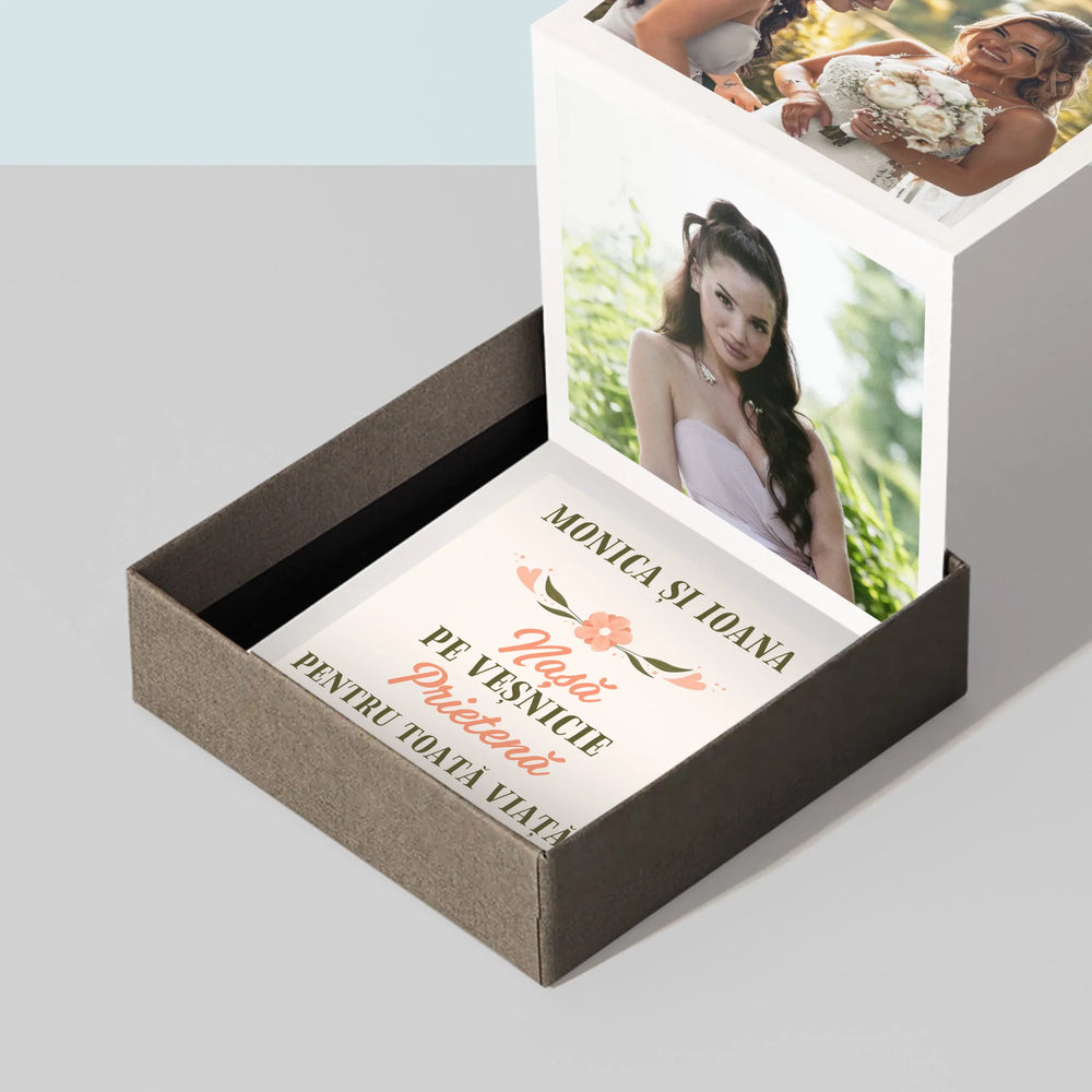 Produsul este compus din trei fotografii cu dimensiunile 6,68 x 6,68 cm si o felicitare personalizata cu destinatia aleasa.