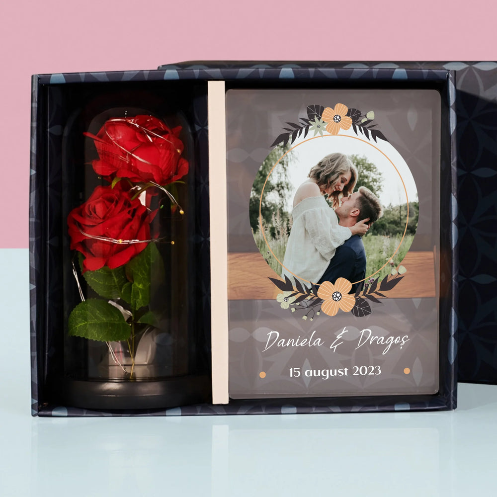 Fotografie Si Semnătură: Îndrăgostiți - Set cadou cu imprimare pe sticlă și trandafirul etern
