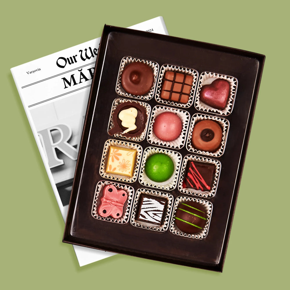 Dimensiuni: 20x15x3,5 cm. Număr pralină: 12.