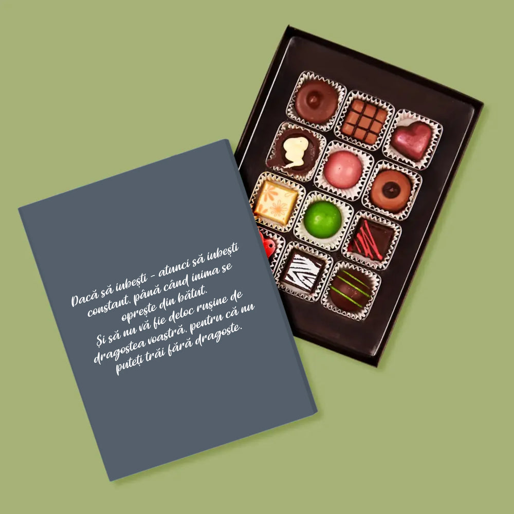 Dimensiuni: 20x15x3,5 cm. Număr pralină: 12.