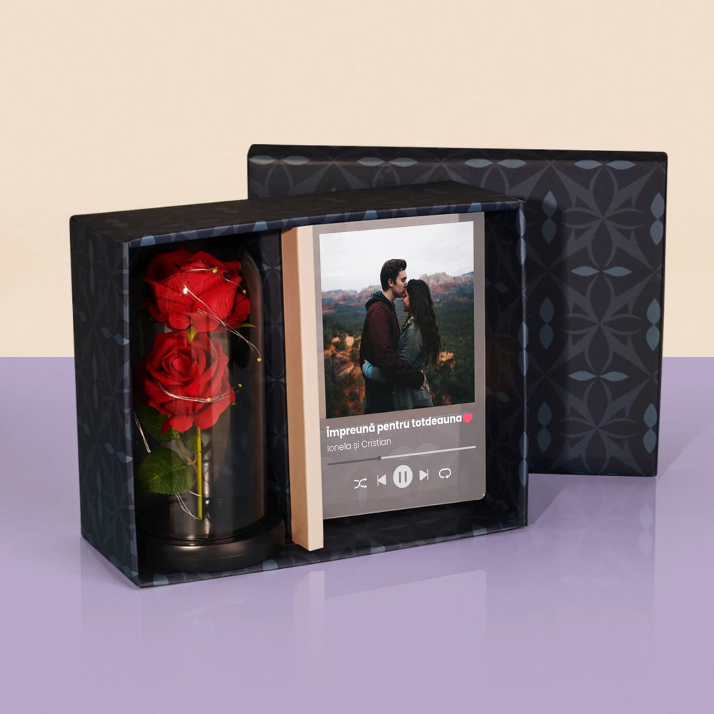 Fotografie Si Semnătură: Spotify Cu Fotografia Ta - Set cadou cu imprimare pe sticlă și trandafirul etern
