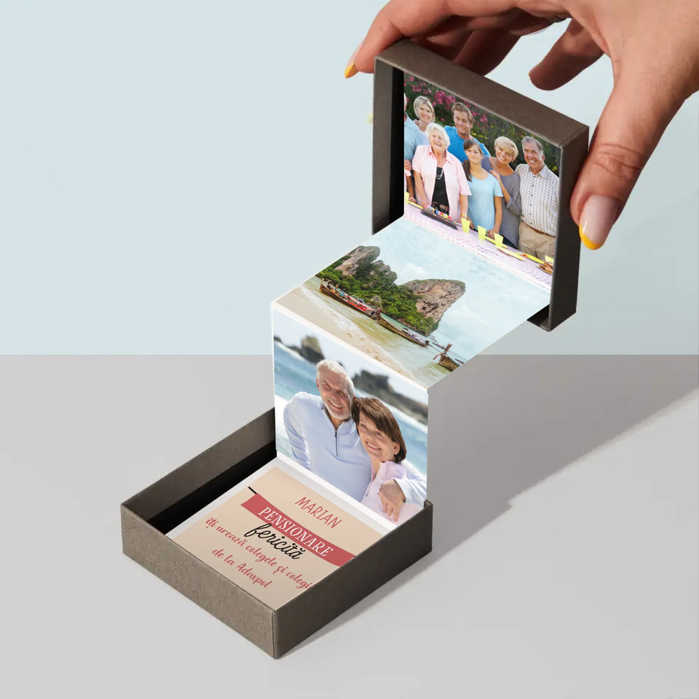 Produsul este compus din trei fotografii cu dimensiunile 6,68 x 6,68 cm si o felicitare personalizata cu destinatia aleasa.